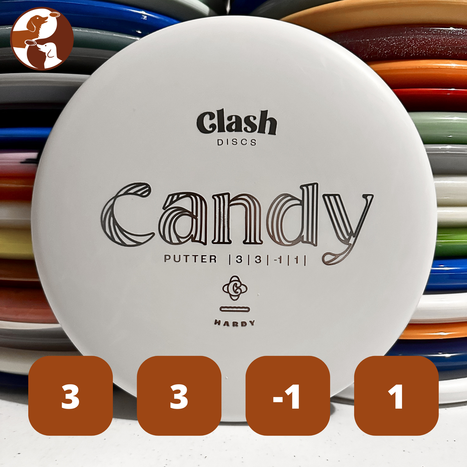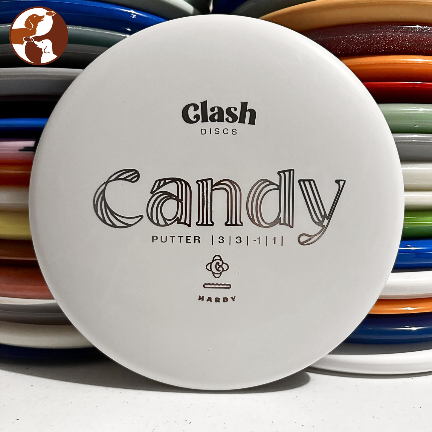 The Clash Discs Candy is a beadless, straight to understable putter. It has a slightly narrower profile than the Popcorn.