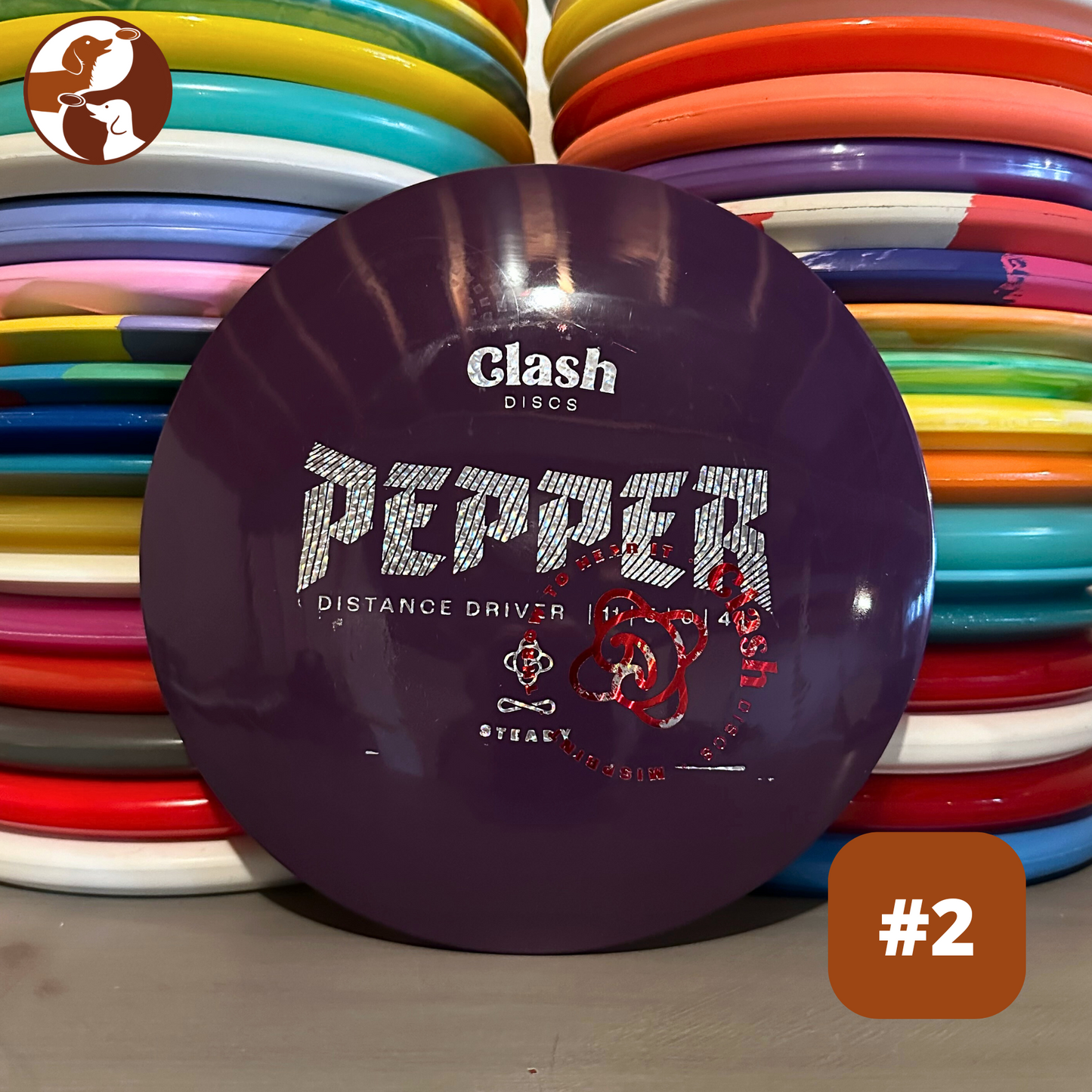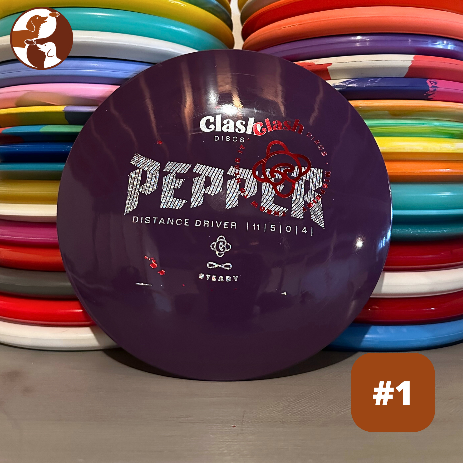 The Pepper is Clash Discs' first distance driver. It is an overstable 11 speed that can handle power, and high winds. This super overstable disc is great for power throws, hyzer bombs, throwing into a headwind, or some tricky utility shots. This spicy distance driver is a trustworthy disc regardless of most situations you may find yourself in.