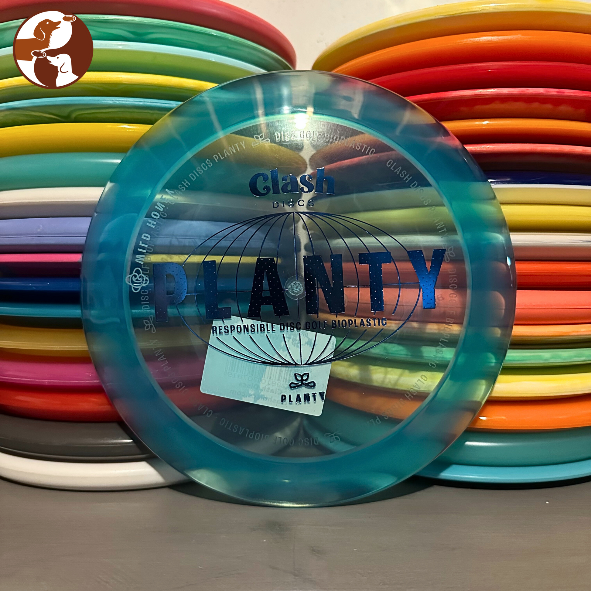 Planty plastic by Clash Discs is an environmentally responsible bioplastic for disc golf. Derived from bio-based materials, Planty utilizes plant-derived oil in its production. The result is a durable, long-lasting, high-performance blend that is not dependent on typical fossil fuels.