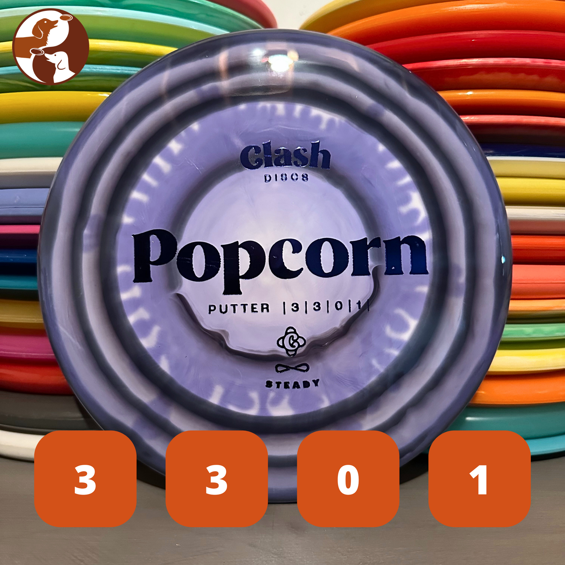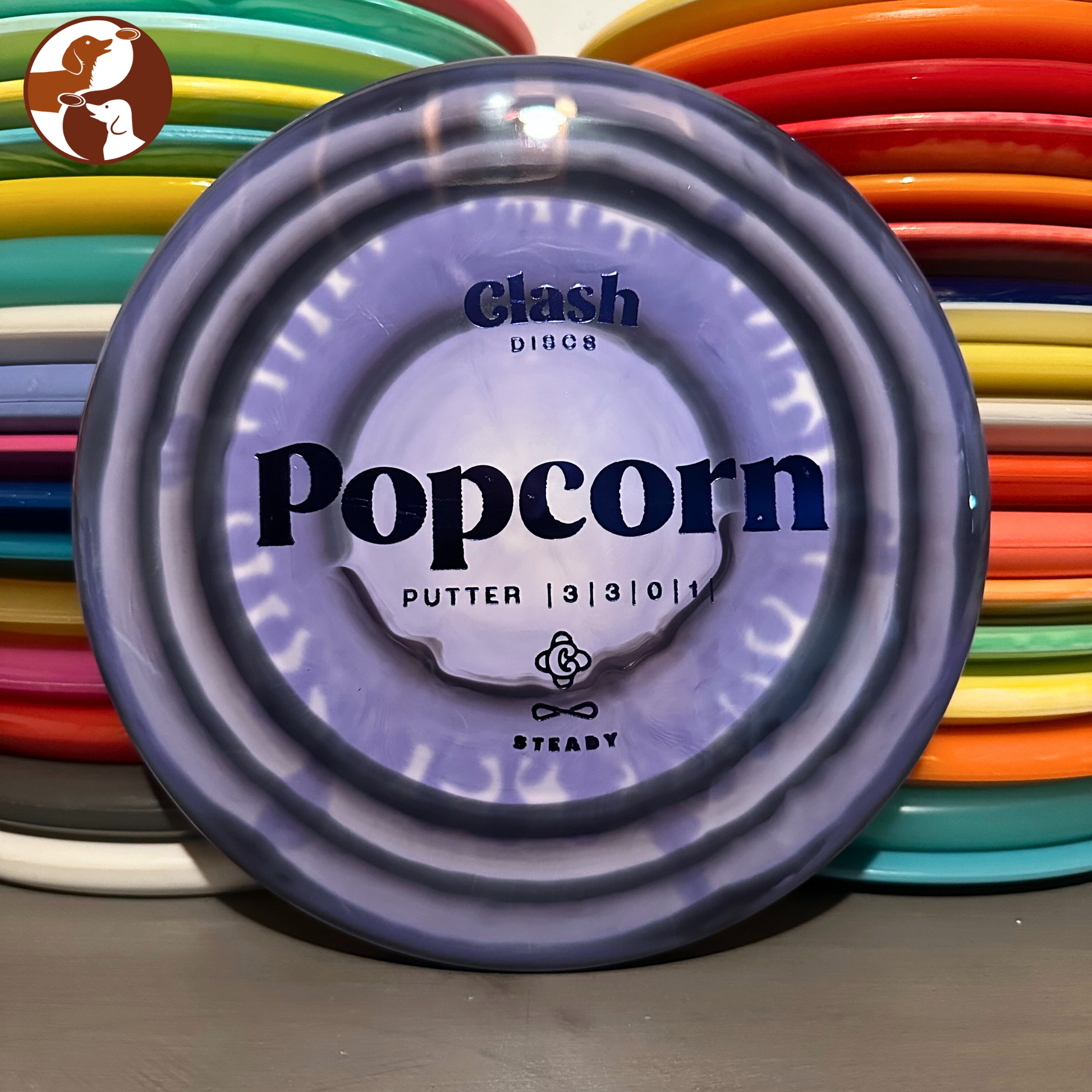 The Clash Discs Popcorn is a straight flying putter. This salty straight putter provides a controllable approach disc that can hold a large variety of lines. This putter can find a spot in your bag as a workhorse of a throwing putter and even a putting putter.