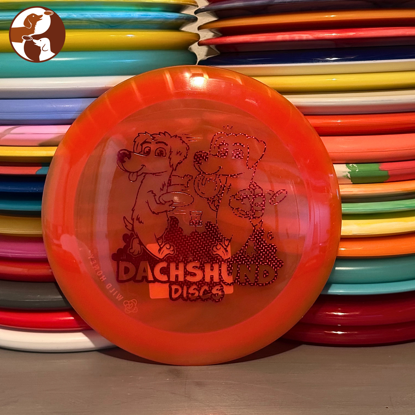One of the latest drivers from Clash Discs is a "sweet" disc. The Wild Honey is an understable distance driver that has a flight similar to that of a Discraft Crank or Innova Mystere. The design principle behind it was to make it a very accessible distance driver for players with slower arm speed. It provides a beautiful long s-curving flight path without much effort. It can be popped on a small hyzer and glide quite a ways before sticking to the fairway.