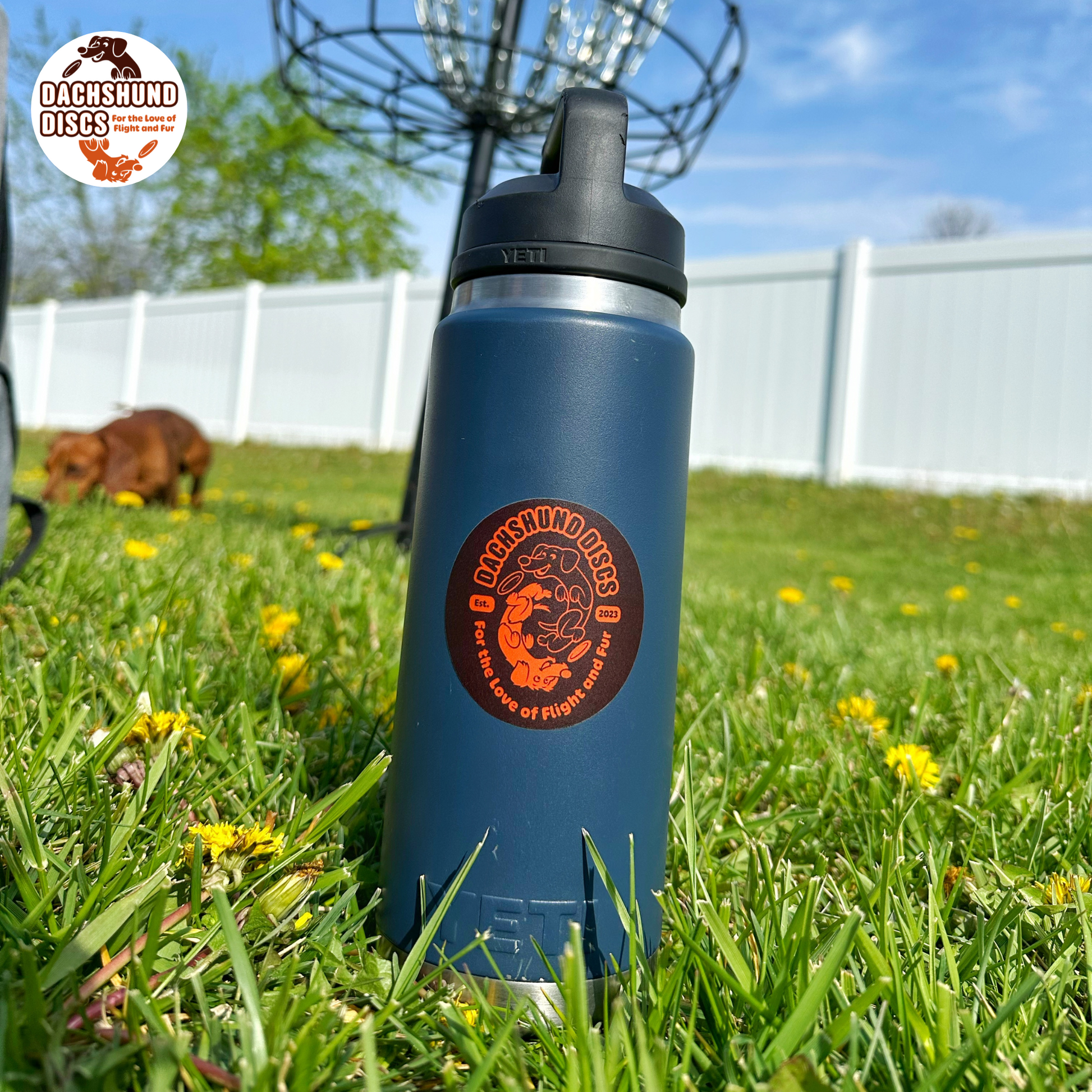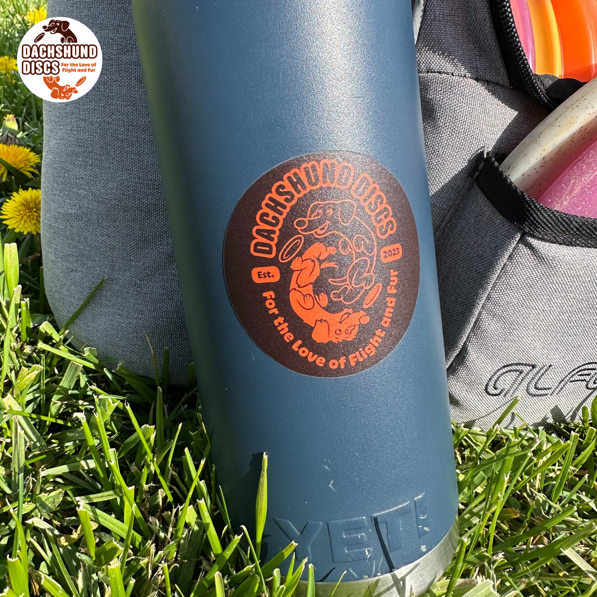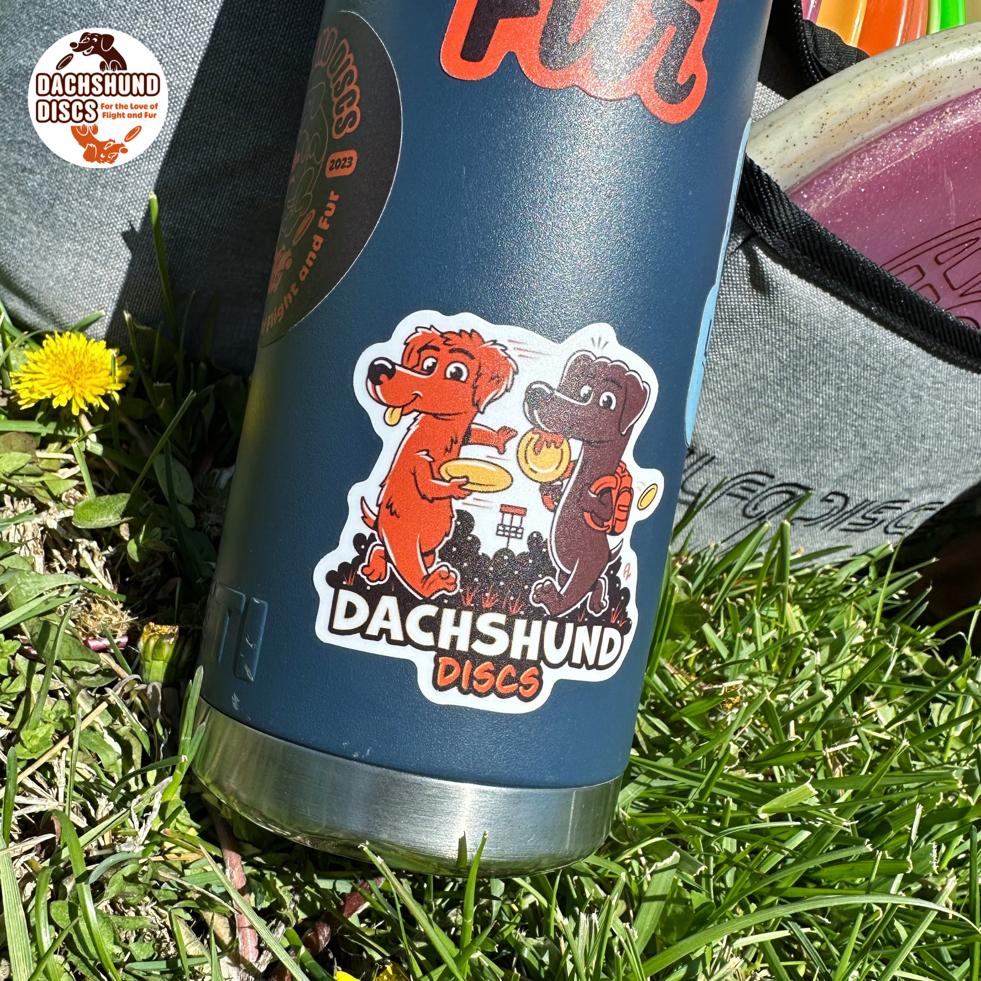 Our 2.5" Dachshund Discs vinyl stickers are Bombproof⢠stickers, built for long-lasting outdoor durability, with vibrant colors, UV-protective laminate, and weatherproof adhesive that can handle just about anythingâsnowboards, water bottles, disc golf carts, and yes, even the dishwasher.