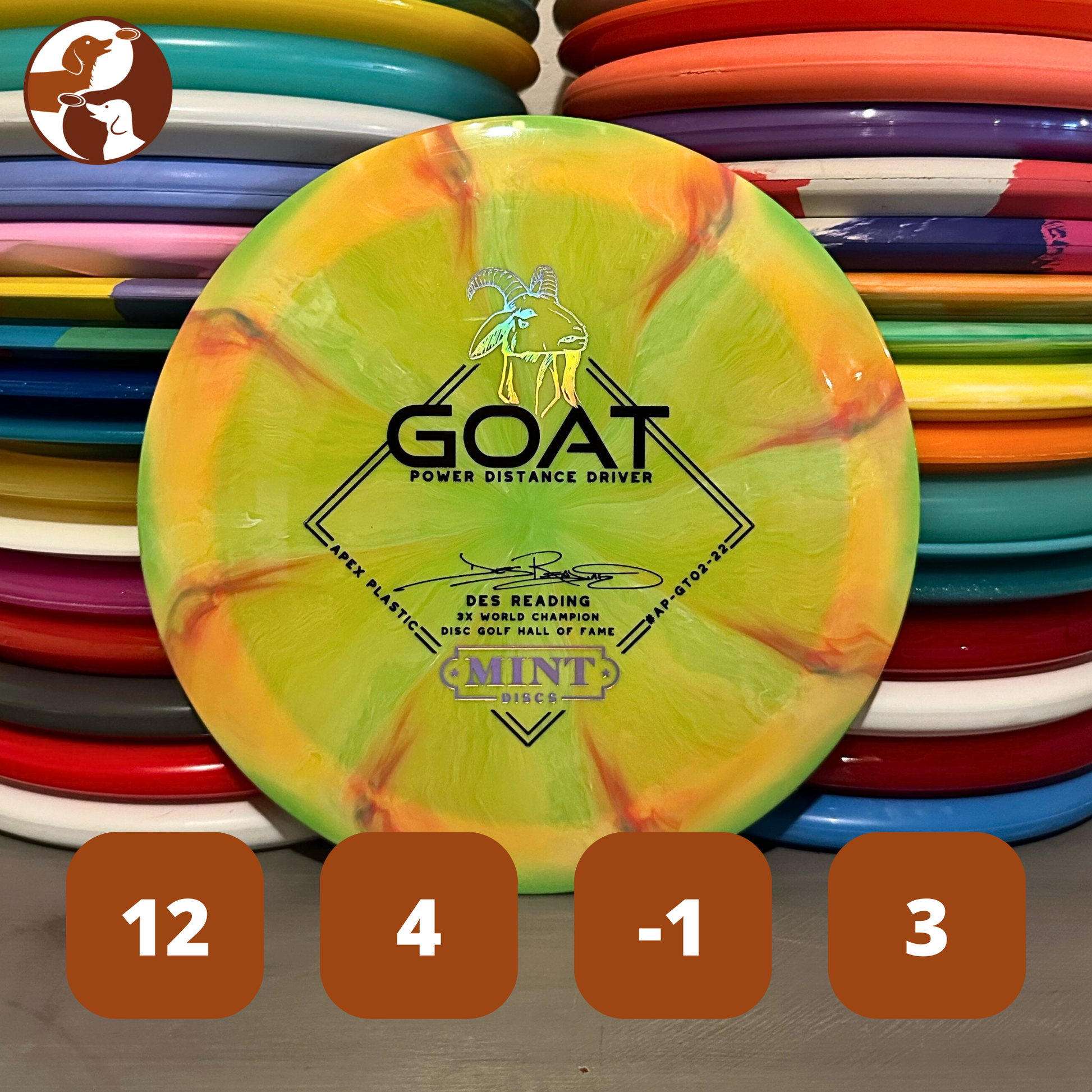 The Des Reading Signature Apex Goat is their furthest flying disc to date. This over stable distance driver jumps out of the hand fast, holds on to your line, and then reliably fades forward.