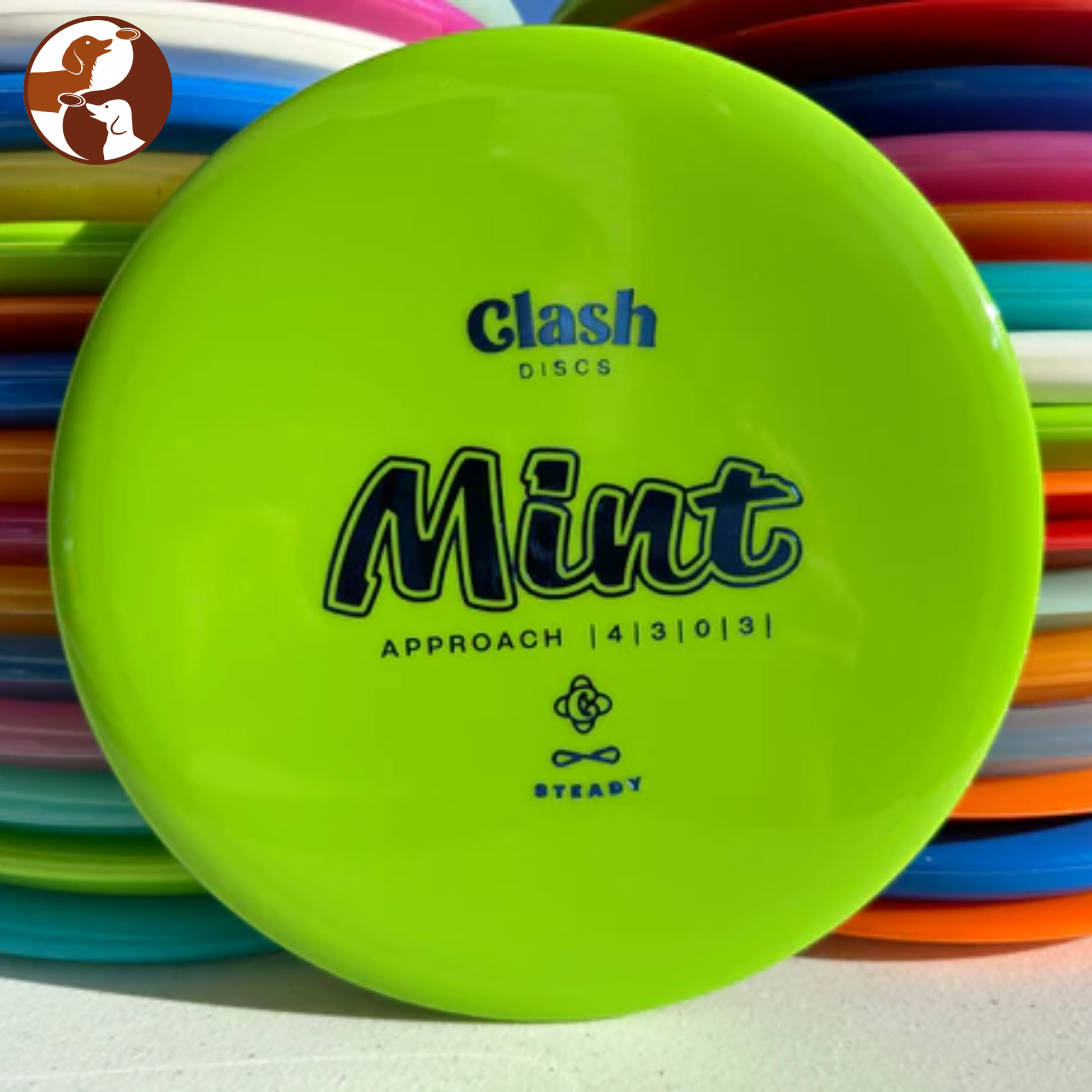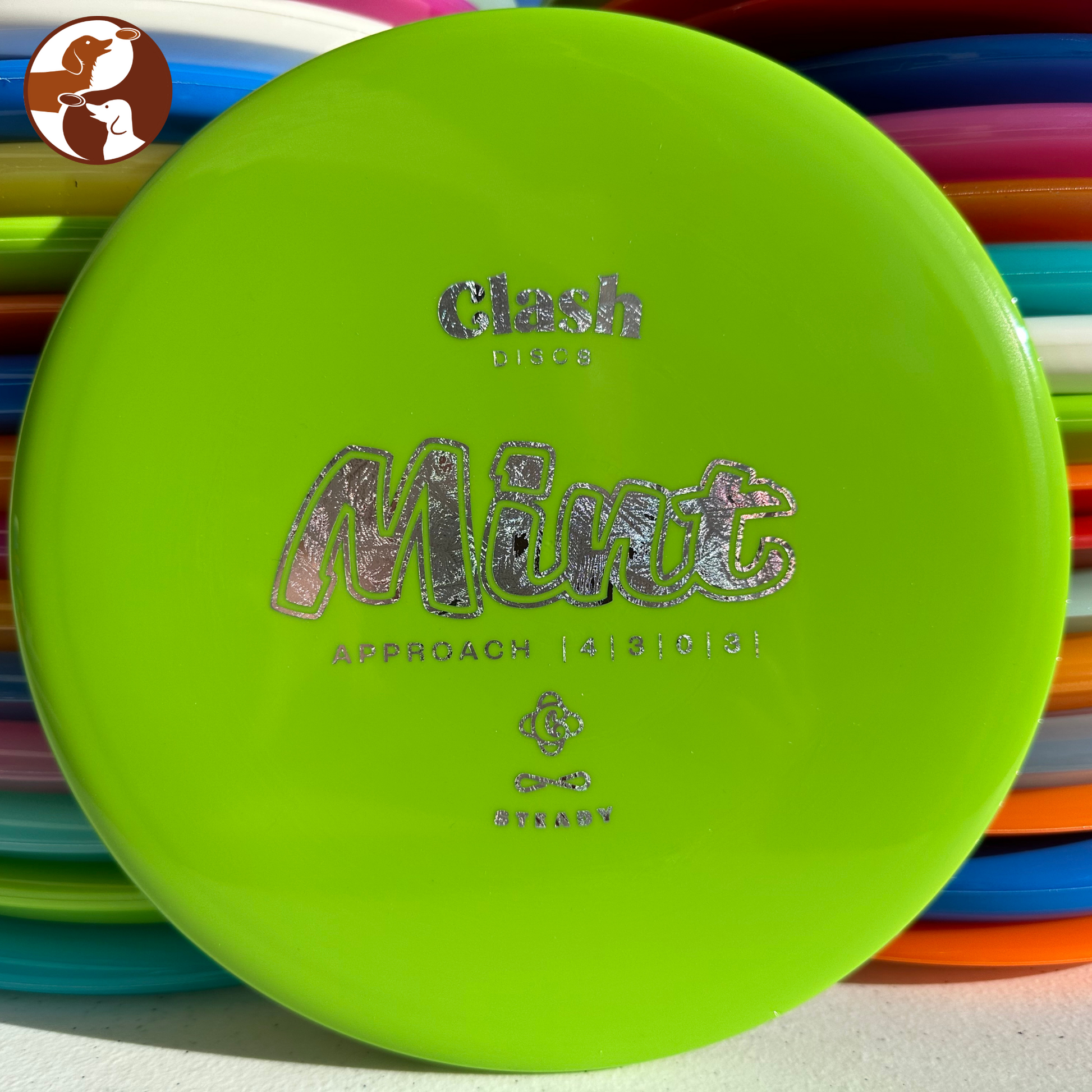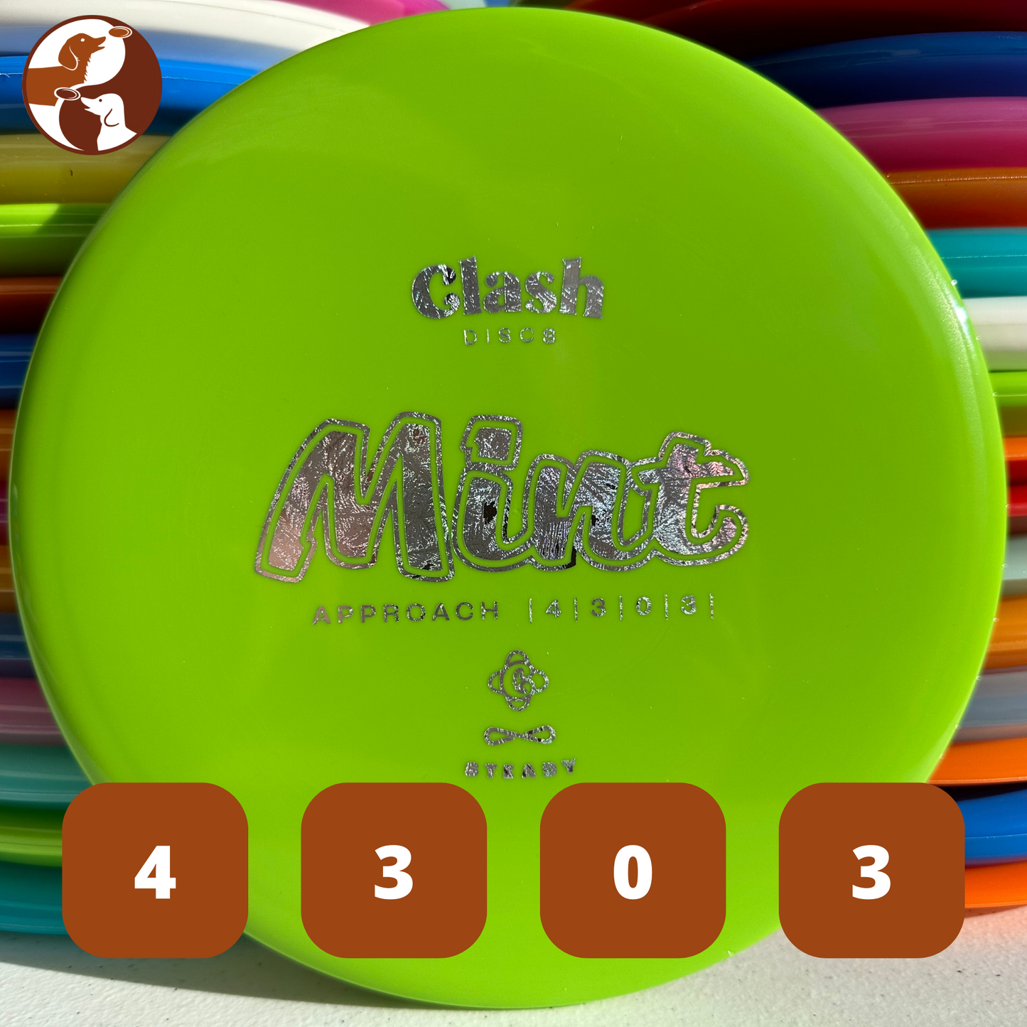 The first disc released by Clash Discs, the Mint is an overstable Putt & Approach disc that keeps its line even with a hard pull. It's beadless similar to the Zone or Harp and will fight a headwind and deliver a reliably hard fade at the end. Thanks to the low profile, it is also ideal for forehand.