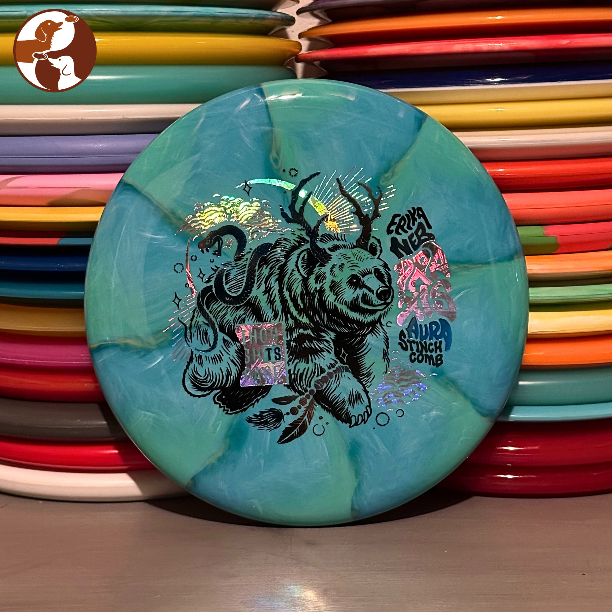 Nebula Aura is a special plastic blend with decorative swirls in bursty patterns. It has an opaque look with great durability and good grip. It is preferred for most drivers and throwers.