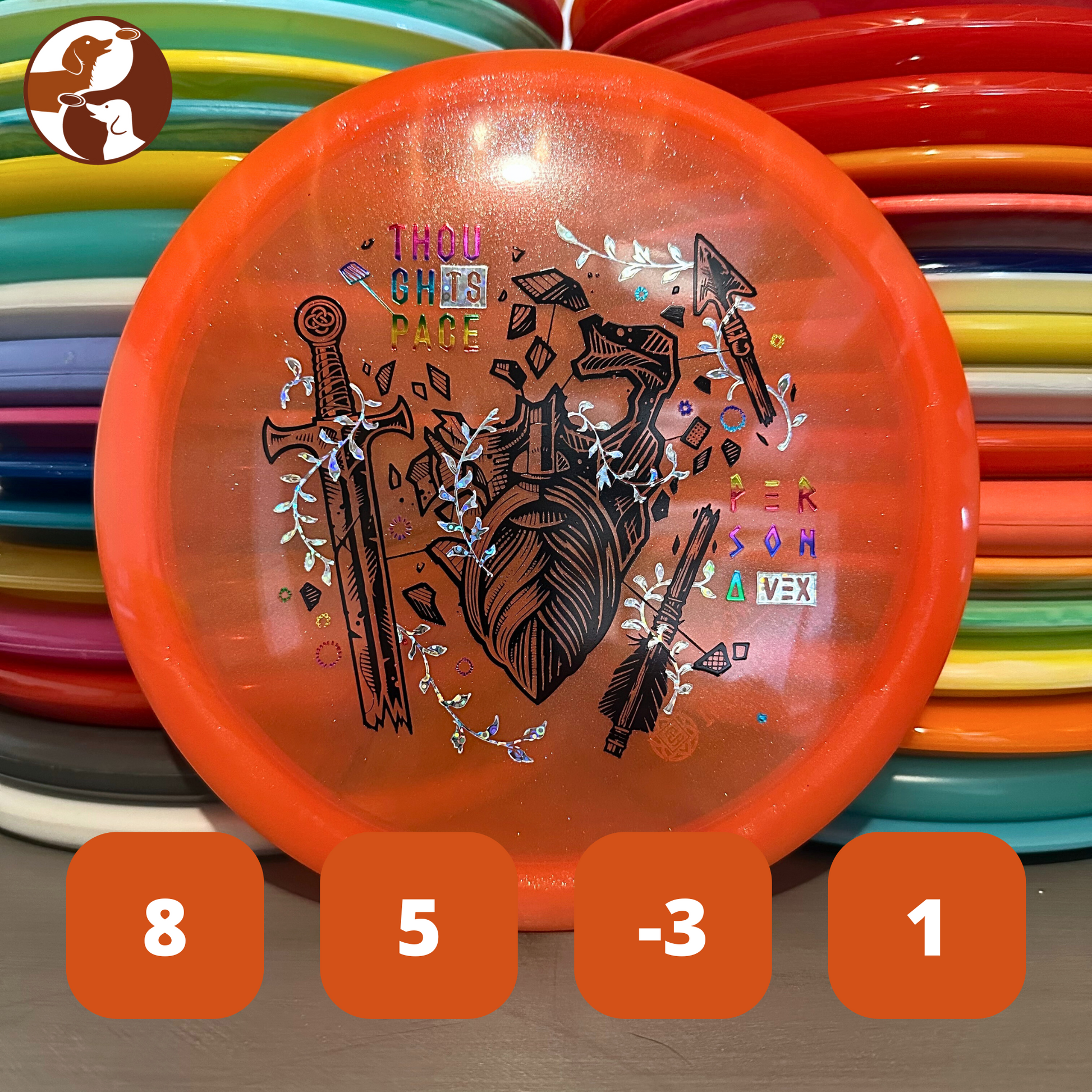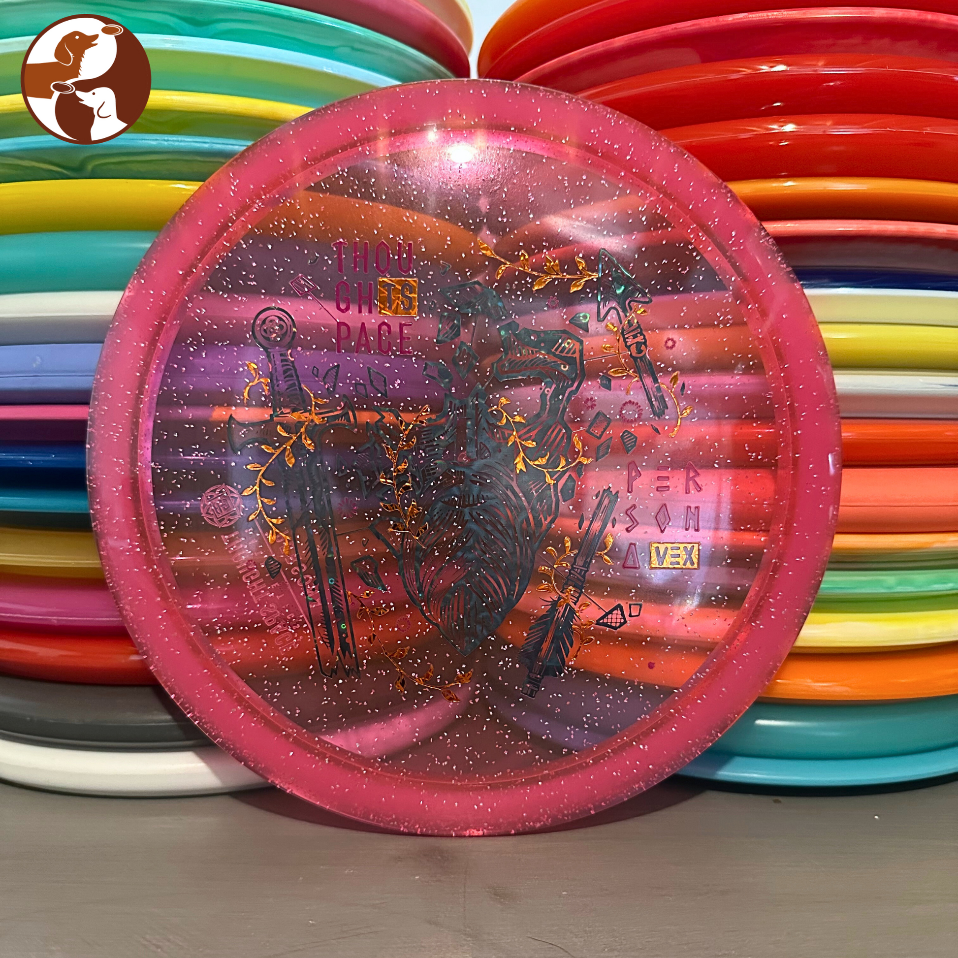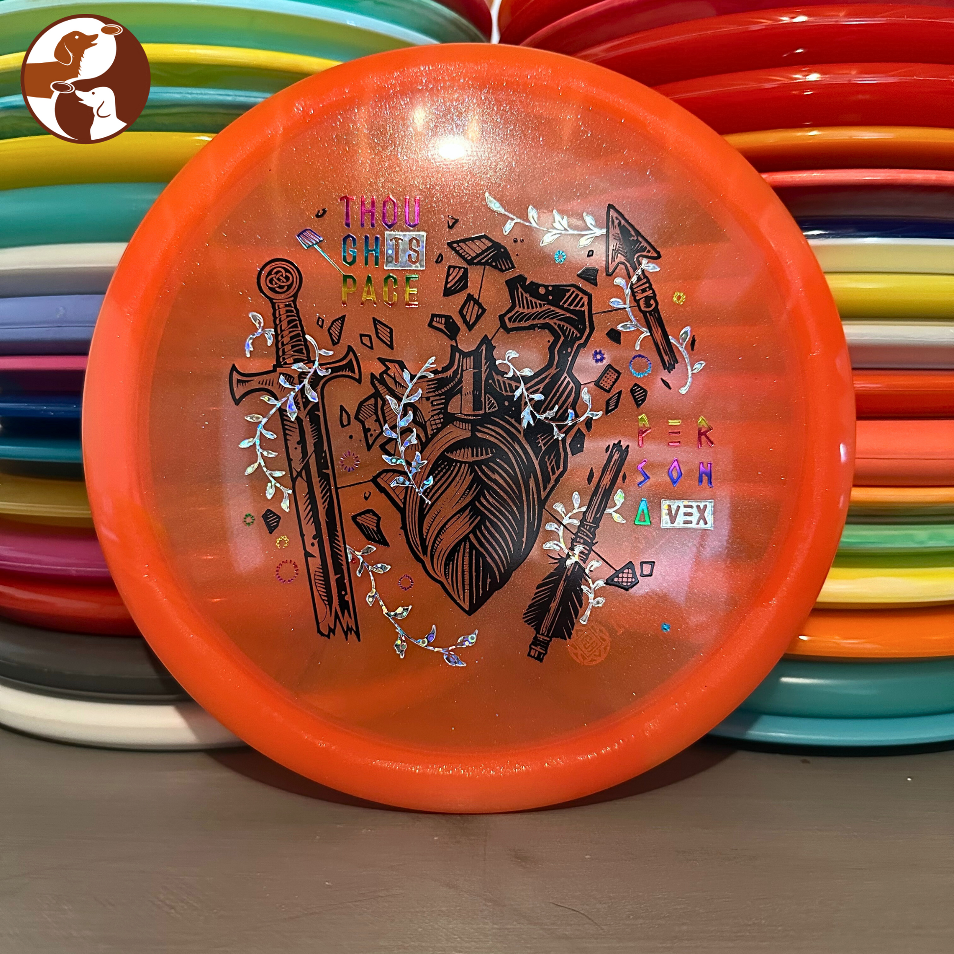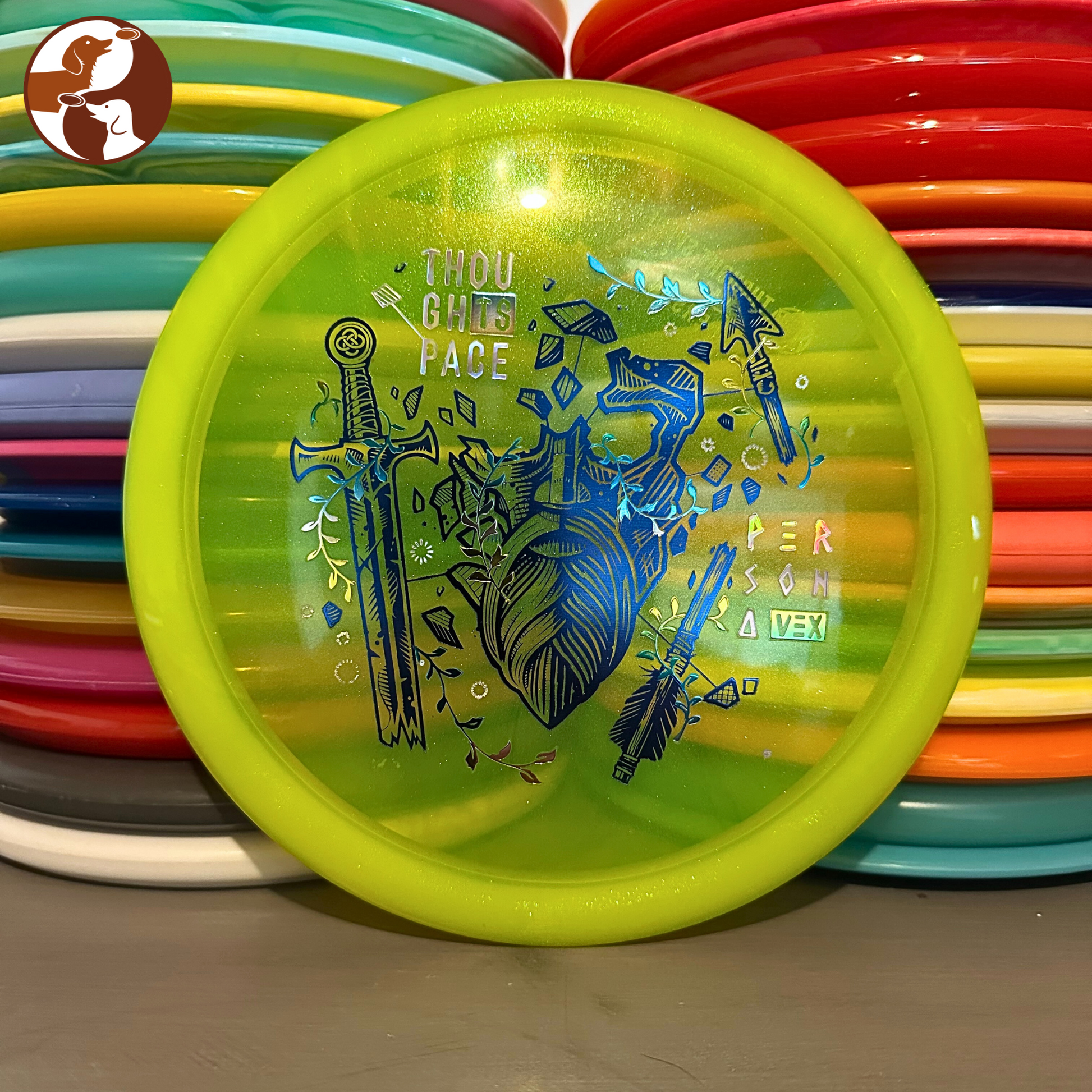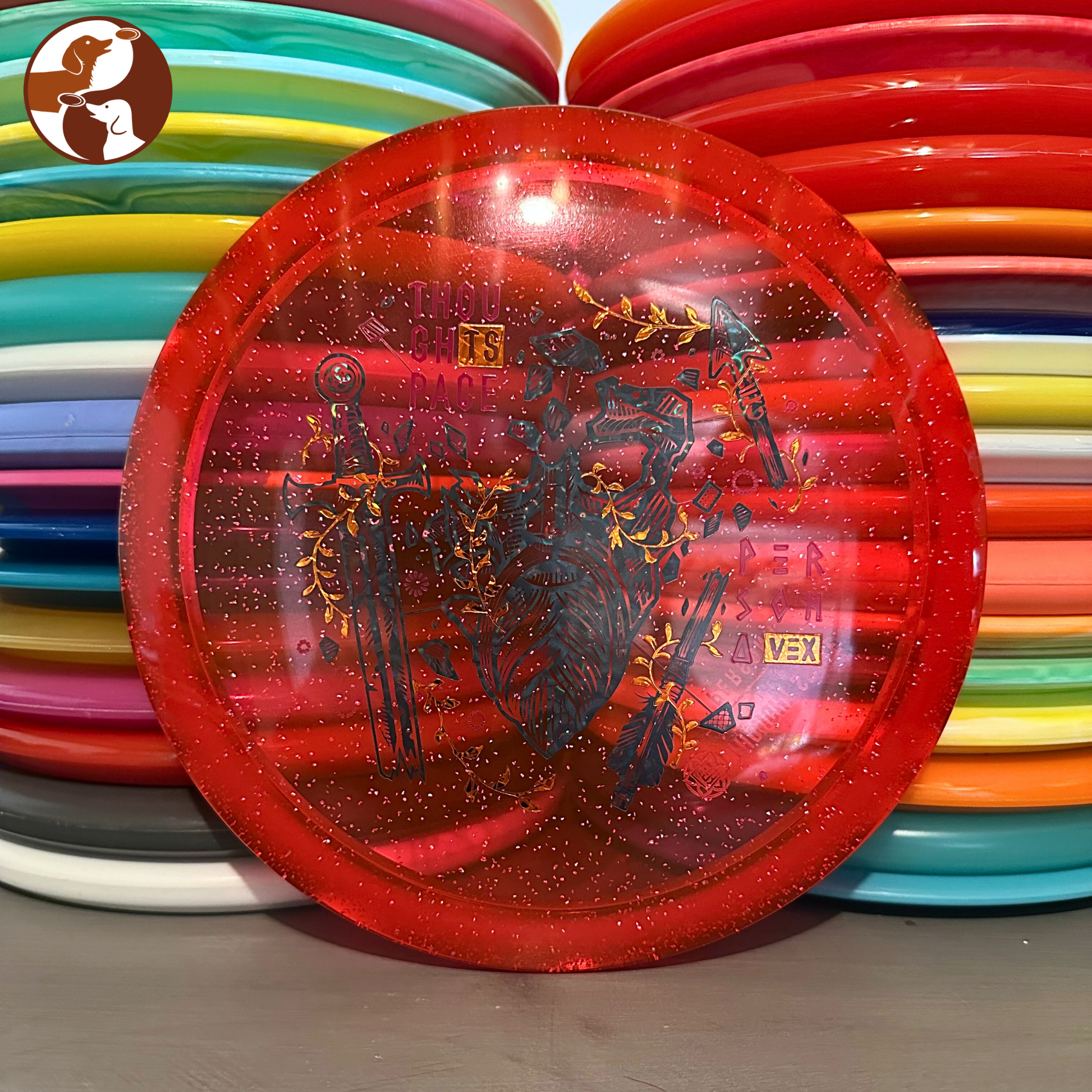 Vex plastic by Thought Space Athletics is a durable, translucent plastic that is available in vibrant colors, often with added sparkle and cosmetic effects. It can be compared to the different varieties of Discraft Z Line plastic.
